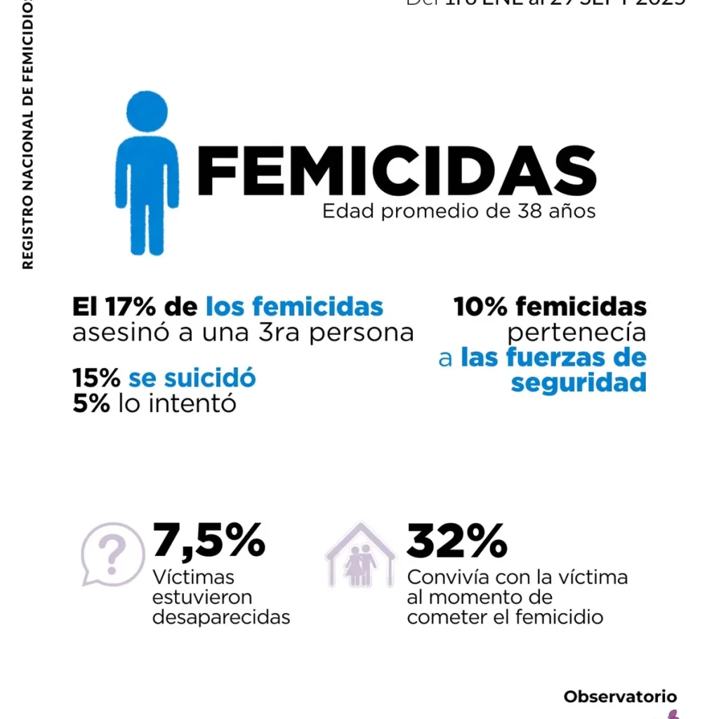En cuanto al perfil de los femicidas, según el informe, la edad promedio es de 38 años y el 10% de ellos pertenece a las fuerzas de seguridad. Además, el 15% cometió suicidio y el 5% lo intentó.