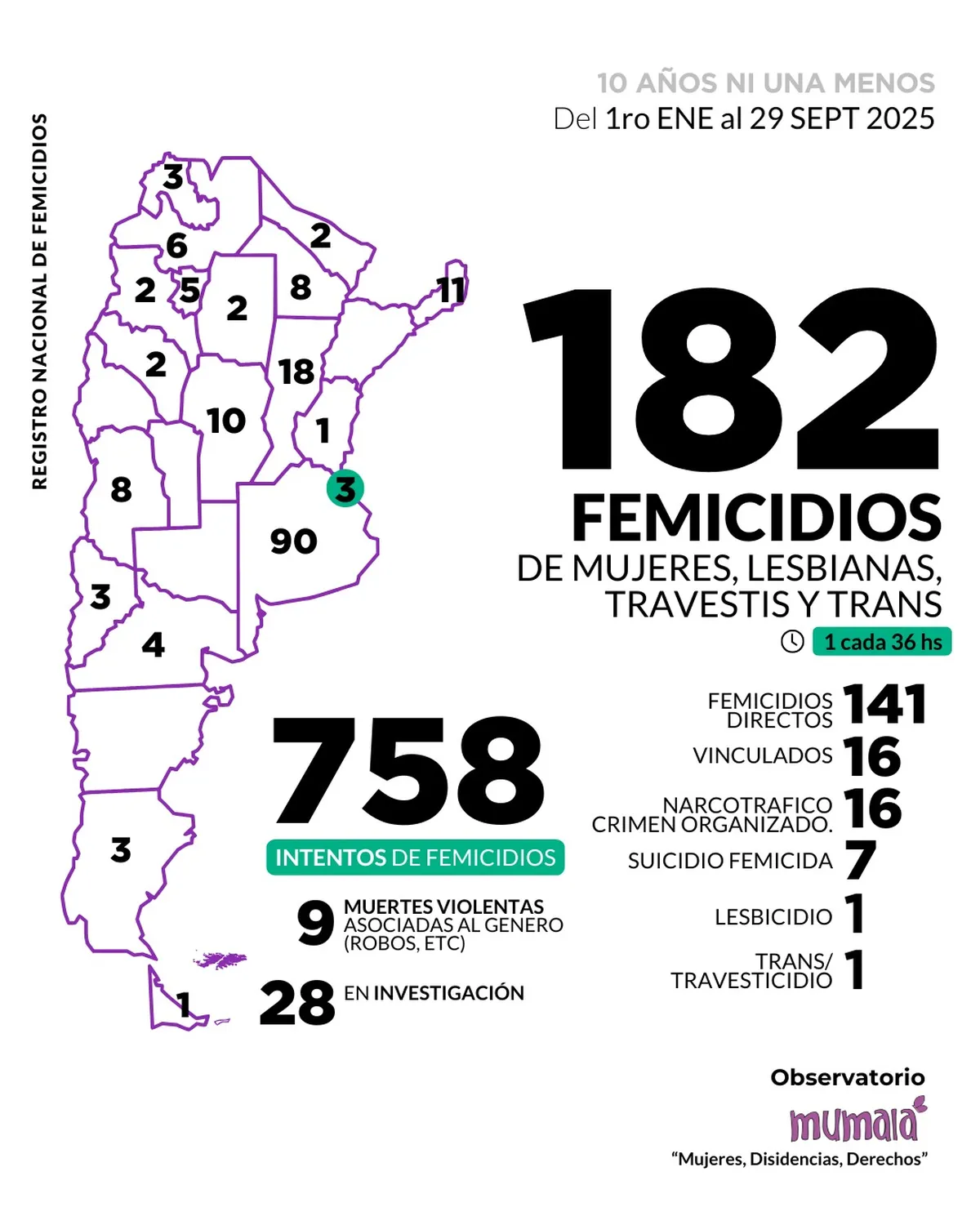 Según el informe del Observatorio Nacional «Mujeres, Disidencias, Derechos», entre el 1 de enero y el 29 de septiembre de 2025 se registraron 182 femicidios de mujeres, lesbianas, travstis y trans (1 cada 36 horas). Del total, la provincia de Santa Fe es la segunda provincia con 18 femicidios registrados en el transcurso de este año.
