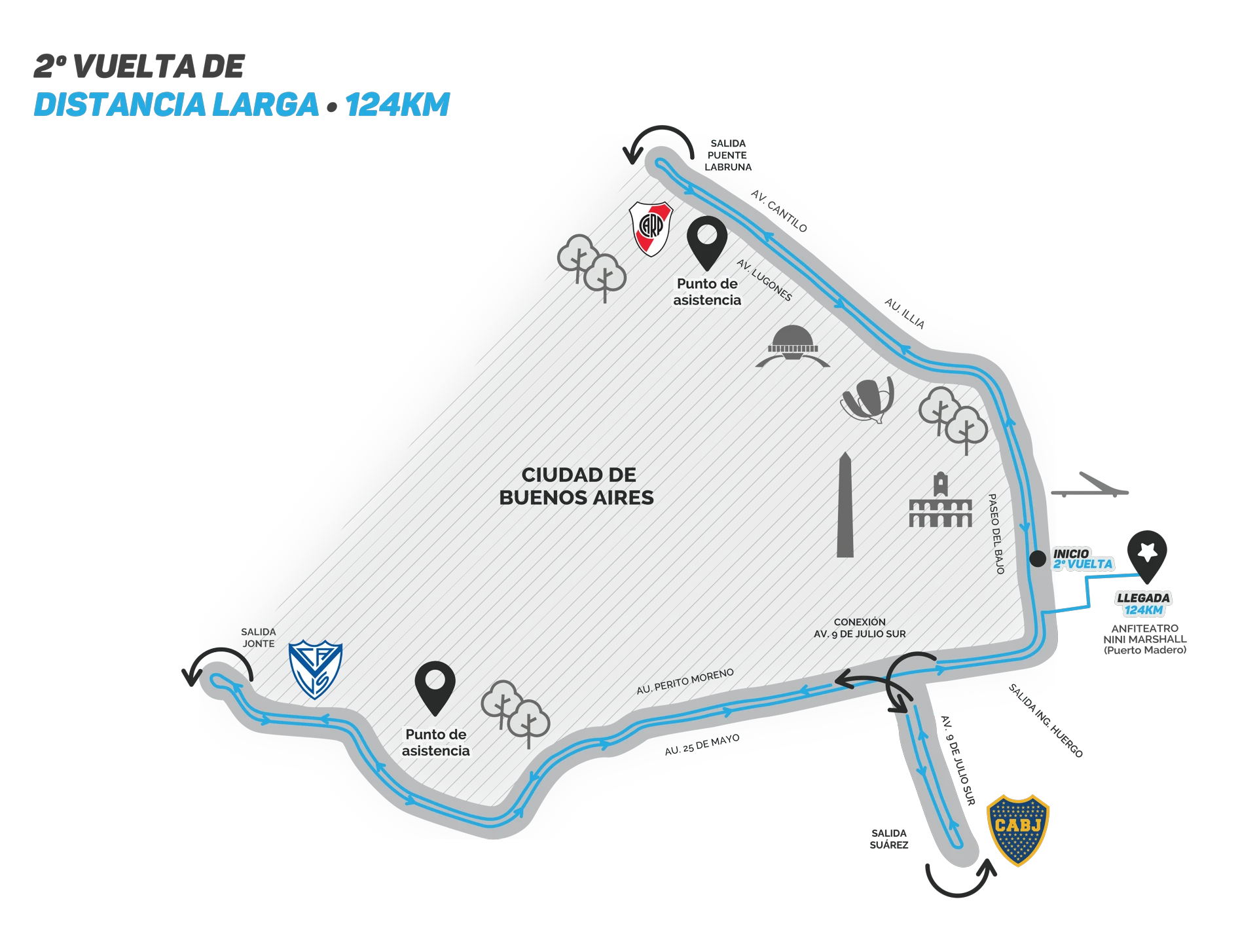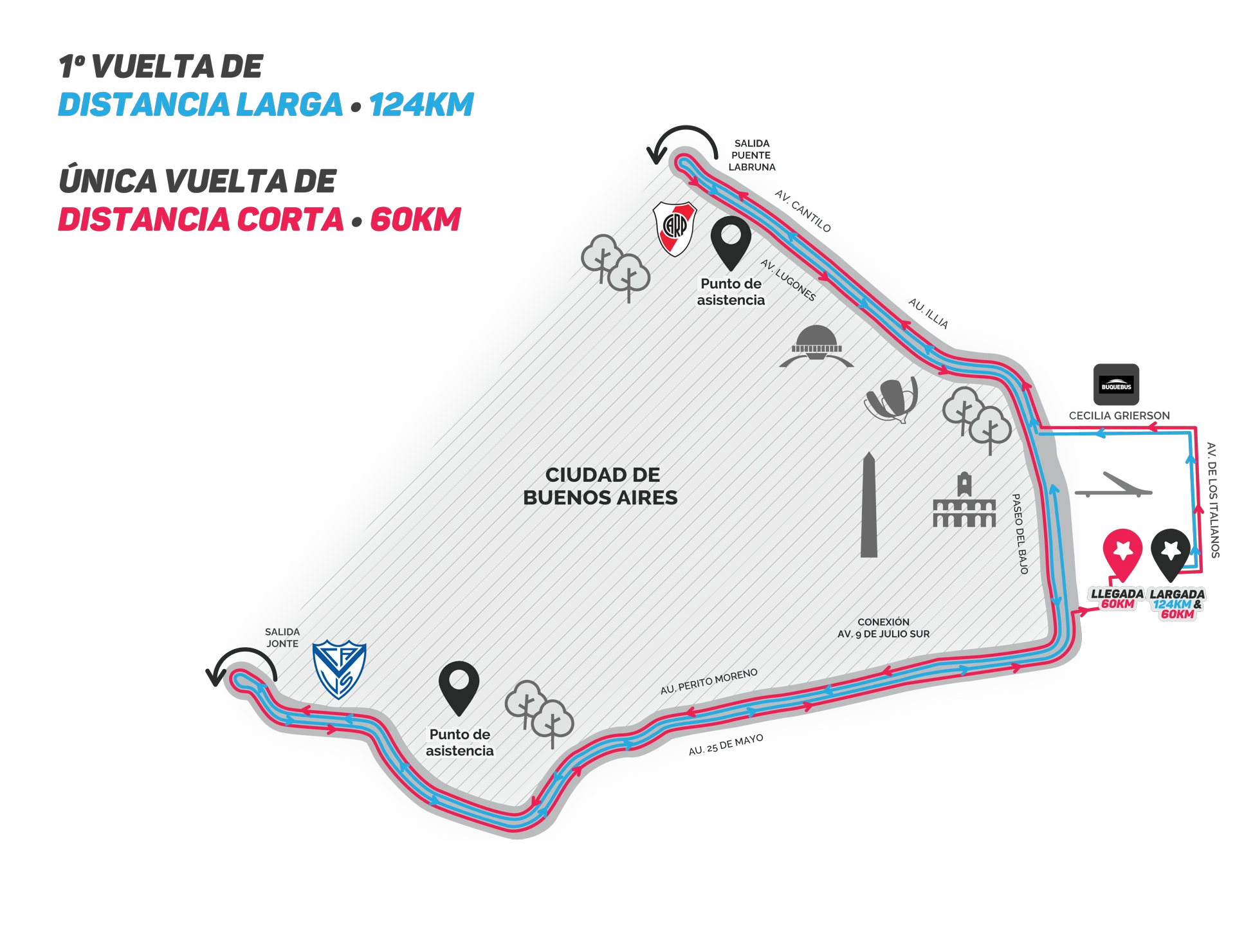 “No es una carrera de calendario profesional, pero estamos hablando de Buenos Aires, una carrera muy importante de rutas, 124 km, hoy cambia un poquito el trazado, pero básicamente sale desde Paseo del Bajo, se va hacia Udaondo, ahí se baja y se vuelve por el carril de enfrente hacia lo que es autopista 25 de Mayo y llegamos hasta la cancha de Vélez y ahí en ese acceso bajamos y volvemos a retomar. Esas son dos vueltas que completan un circuito de 124 km. Mayormente llano, hay alguna cuestión de desniveles, pero son pocos porque solamente la parte de los accesos a los puentes no suma tanto desnivel”.