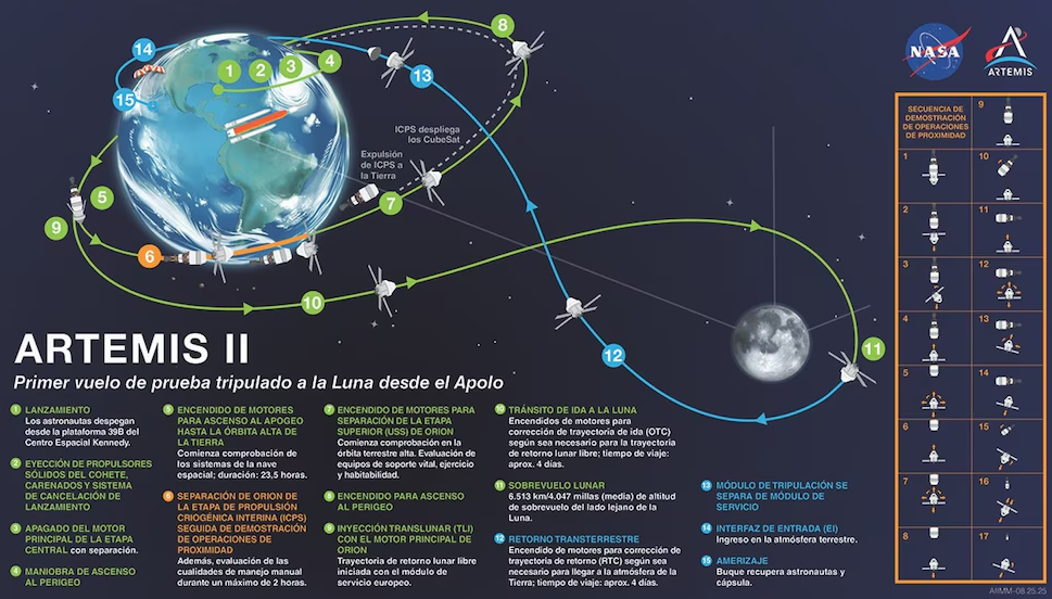 El vuelo servirá para validar los sistemas clave del cohete Space Launch System (SLS) y la cápsula Orion, ambos desarrollos centrales del programa Artemis. La travesía se extenderá por aproximadamente 10 días, período en el que la tripulación orbitará la Luna y retornará a la Tierra, con un amerizaje controlado en el océano Pacífico.