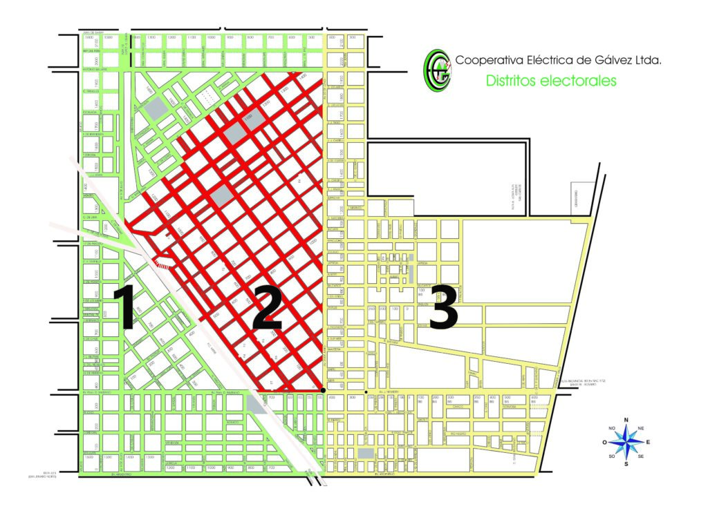 DISTRITO Nº 2: Asociados domiciliados en la zona media y central del área urbana de la ciudad, comprendida entre el Noreste de las vías del ferrocarril N.C.A. (ramal Rosario–Rafaela) desde su intersección con Av. Jorge Newbery hasta su intersección con Av. 9 de Julio, por esta (sin que ninguna vereda conforme este Distrito) hasta su intersección con calle Granadero Baigorria; y desde aquí (sin que ninguna vereda conforme este Distrito) hacia el este hasta calle B Mitre., luego por B. Mitre hacia el Noroeste hasta Yapeyú, sigue por Yapeyú hasta Ballaris, y por Ballaris hacia el Este, hasta su intersección con Av. 20 de Junio; y desde esta esquina, el límite Este es toda la Avda. 20 de Junio (pero ninguna de las veredas de calle Yapeyú, Ballaris, y Av.20 de Junio conforman este Distrito) hasta la intersección con Av. Jorge Newbery; y desde allí, va hacia el Oeste por toda la vereda Norte de Av. Jorge Newbery hasta las vías del Ferrocarril, cerrando la figura. A modo de ejemplo: están comprendidos en esta zona todos los vecinos domiciliados en la zona Centro, Capitán Bermúdez, Sarmiento, y parte de los Barrios: Anastasio Arana, Altos del Norte, Santa Margarita, y Tropezón. La Asamblea se realizará en la sede de nuestra Cooperativa, sita en calle San Martín N° 106 de esta ciudad de Gálvez.