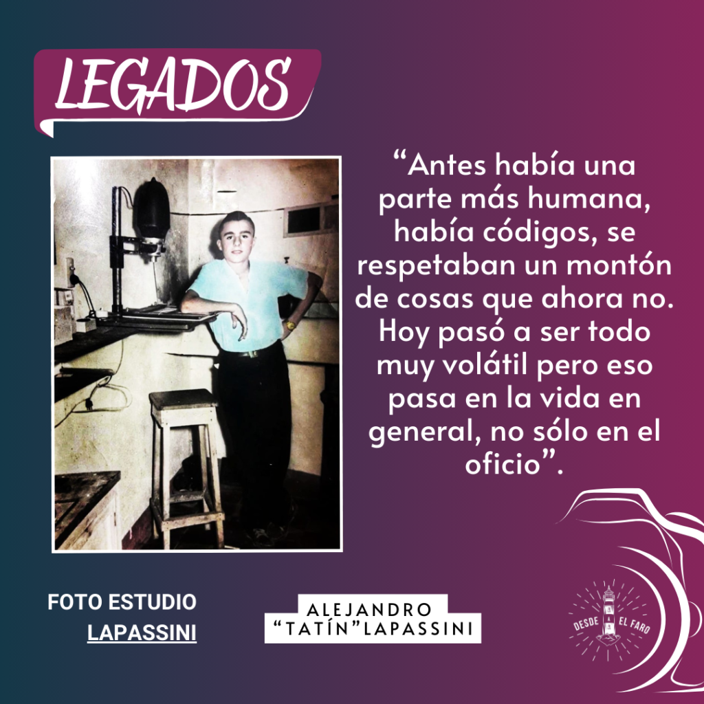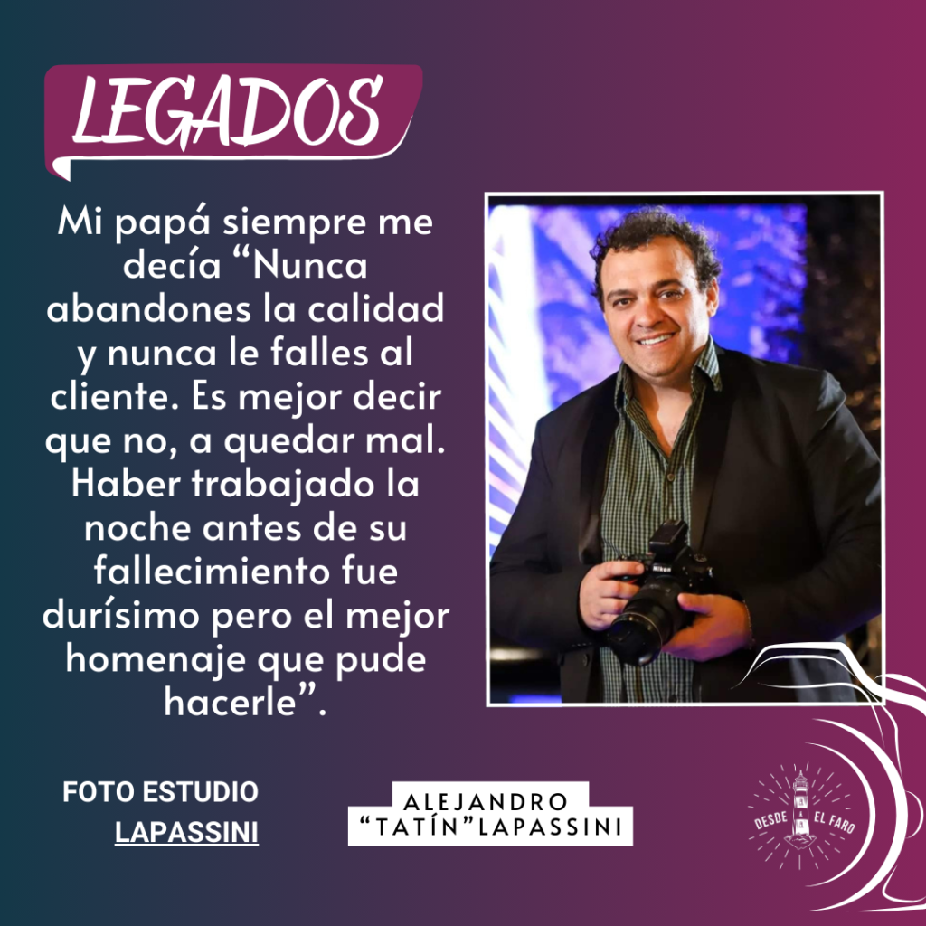 El pasado 21 de septiembre se conmemoró el Día del Fotógrafo y si uno habla de fotografía en Gálvez, inmediatamente se referencia en dos apellidos: Primón y Lapassini. Por eso, hoy inauguramos nuestra sección “Legados” con una entrevista a Alejandro “Tatín” Lapassini, hijo y sobrino de dos históricos de este oficio que él hoy continúa. Aquí, sus conceptos más destacados;