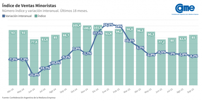 En septiembre, las ventas minoristas pymes registraron una variación interanual de -4,2% a precios constantes, mientras que, en la comparación mensual desestacionalizada, la variación fue de -2%. En lo que va del año, acumulan un incremento interanual del 5%.
