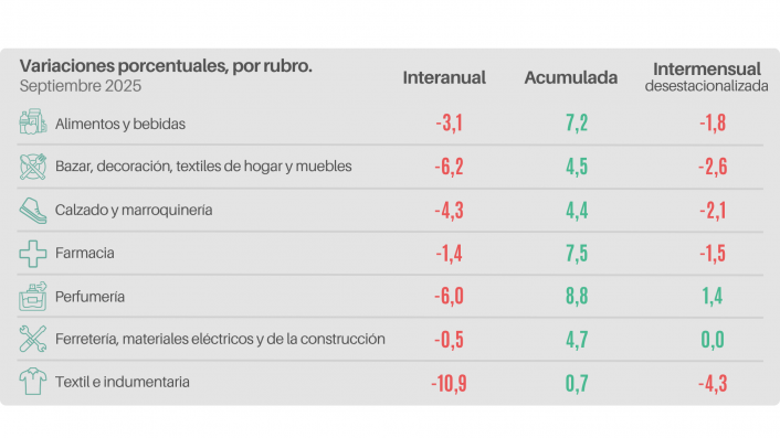 En el análisis por rubros, la situación fue homogénea, con caídas interanuales en todos los sectores. Los más afectados fueron Textil e indumentaria (-10,9%) y Bazar, decoración, textiles para el hogar y muebles (-6,2%). En la comparación intermensual, la tendencia fue similar, salvo en Perfumería, que registró un crecimiento del 1,4% respecto del mes anterior, y en Ferretería, materiales eléctricos y de la construcción, que mantuvo los mismos niveles de ventas.