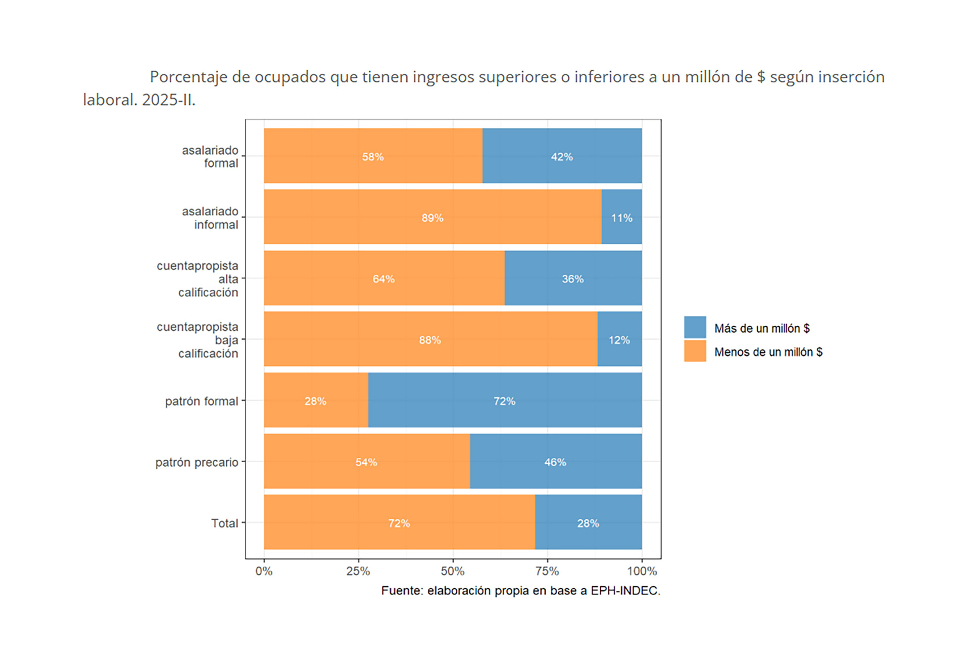 El reporte destaca que incluso dentro del grupo de los asalariados formales, el segmento mejor remunerado del universo laboral, el 58% no supera ese umbral, lo cual “evidencia una crisis generalizada de ingresos que trasciende la informalidad y afecta la capacidad de amplios sectores de la población para cubrir sus necesidades básicas”.