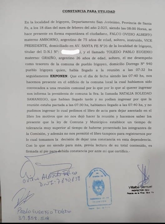 El reclamo de ambos funcionarios proviene de una de las últimas reuniones de Comisión, donde fueron impedidos de ingresar por llegar 10 minutos tarde, según consta en la constancia policial. Tras ello, Samaniego redobló la apuesta, y salió a criticar fuertemente a Toledo, haciéndolo responsable de no firmar documentos de vital importancia para el normal funcionamiento de la Comuna.