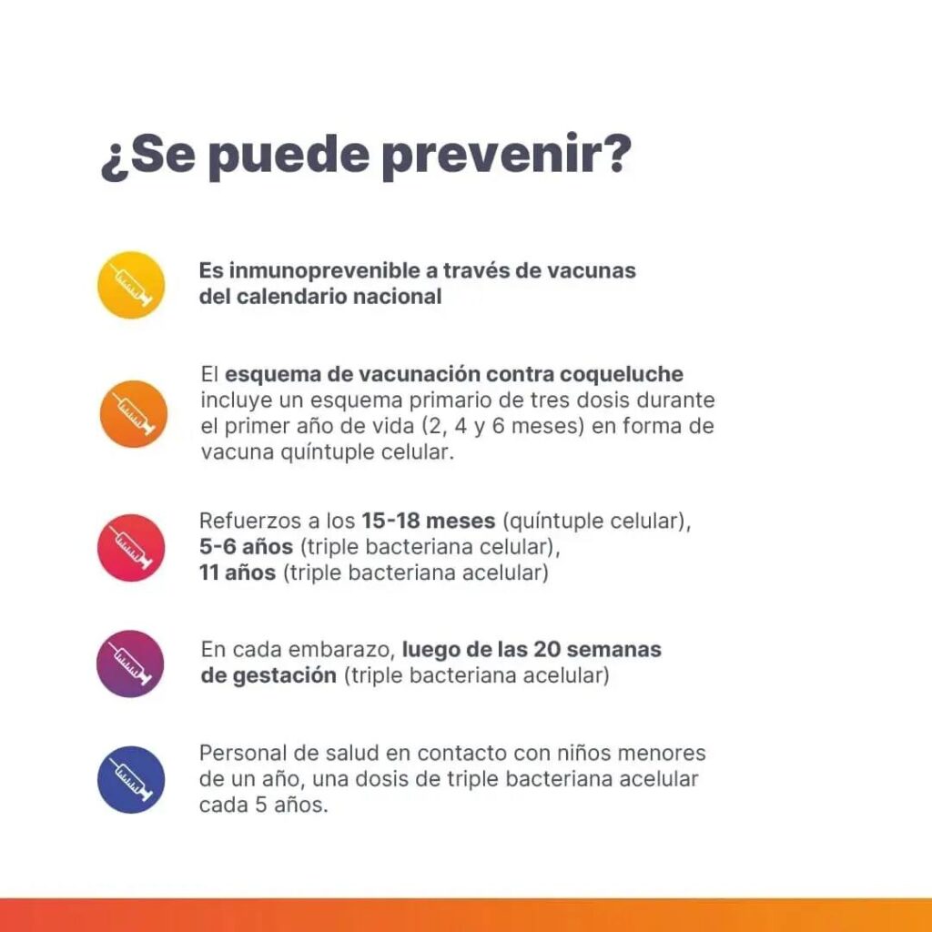 El esquema de vacunación contra coqueluche incluye un esquema primario de tres dosis durante el primer año de vida (2, 4 y 6 meses) en forma de vacuna quíntuple celular, y refuerzos a los 15-18 meses (quíntuple celular), 5-6 años (triple bacteriana celular), 11 años (triple bacteriana acelular) y en cada embarazo luego de las 20 semanas de gestación (triple bacteriana acelular).