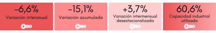 Los resultados surgen del Índice de Producción Industrial Pyme (IPIP) que elabora CAME (Confederación Argentina de la Media Empresa), con una muestra que alcanzó a 420 industrias pyme a nivel federal.