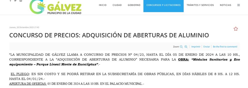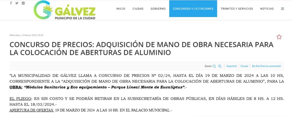 Cabe destacar que al poco tiempo de recibido ese dinero, como se observa en las imágenes de abajo) desde el Ejecutivo se realizó un llamado oficial a Concurso de Precios para la adquisición de aberturas y que en el mes de marzo también se llamó a concurso para la mano de obra destinada a la colocación de dichas aberturas. Pero nada se sabe sobre lo ocurrido en ambos concursos, si realmente se realizó la compra de las aberturas o no, si se contrató la mano de obra o no, si se utilizó el dinero o no. Muchas preguntas que deberían tener una respuesta oficial.